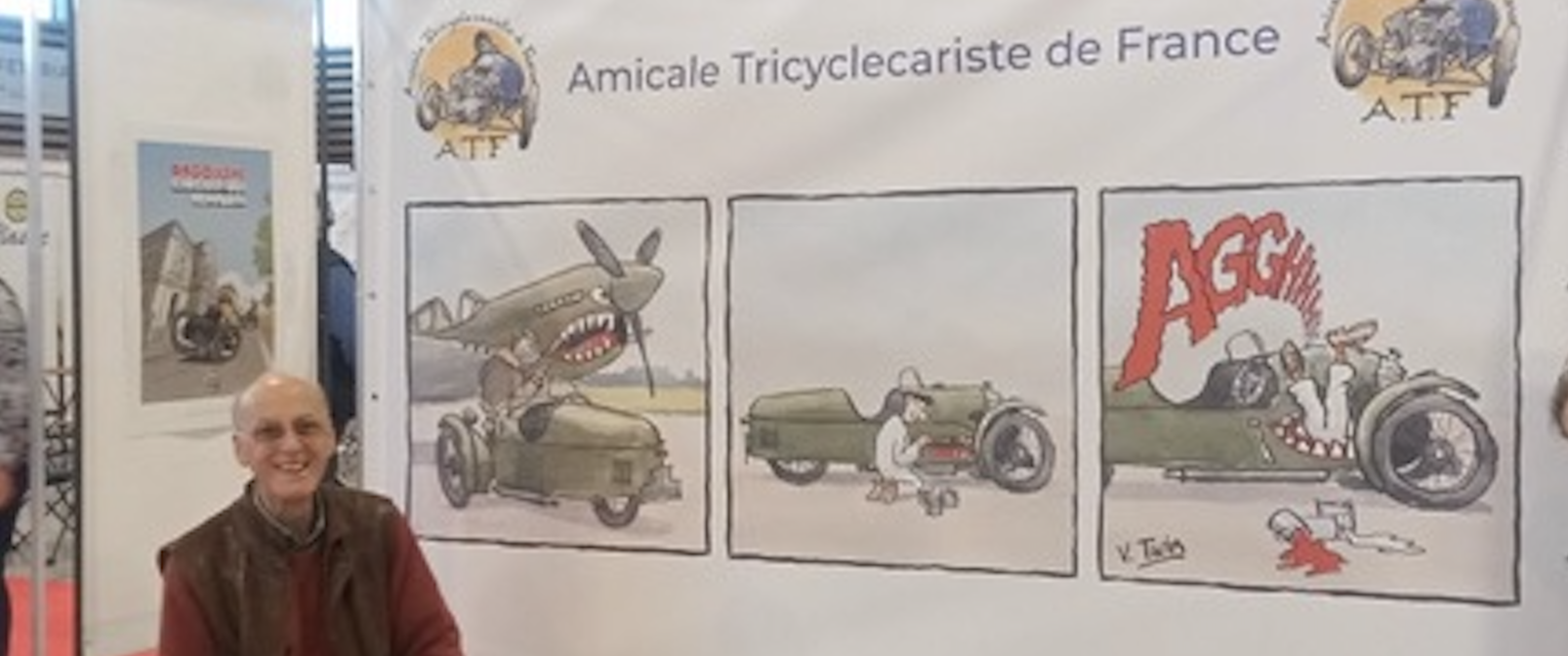Cette année, le concours des stands avait pour thème le 9ème art. Il n'était pas facile de participer sans risquer les foudres des éditeurs de BD … .Le plus attrayant sur notre stand s'appelait la Malédiction du kougelhoppf, sur lequel figurait un Morgan quasiment identique à celui d'un de nos adhérents, qui était en réalité un pastiche de Blake et Mortimer. Le dessinateur, Marc Ostermann a modifié son œuvre par quelques adaptations. Nous avons également interrogé Grahame Joseph, alias V Twin, dessinateur attitré du mensuel anglais « The Bulletin » édité par le Morgan Three Wheeler Club . Très enthousiaste à l'idée de faire une petite BD pour l'ATF il nous en a fourni deux, et nous a fait l'honneur de traverser la Manche pour venir nous voir sur le stand à Reims.